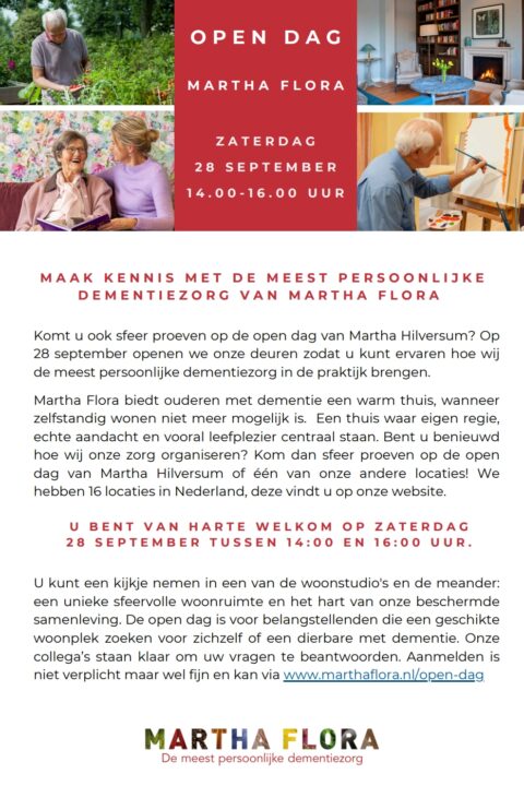 Komt u ook sfeer proeven op de open dag van Martha Flora? Op 28 september openen we onze deuren zodat u kunt ervaren hoe wij de meest persoonlijke dementiezorg in de praktijk brengen.