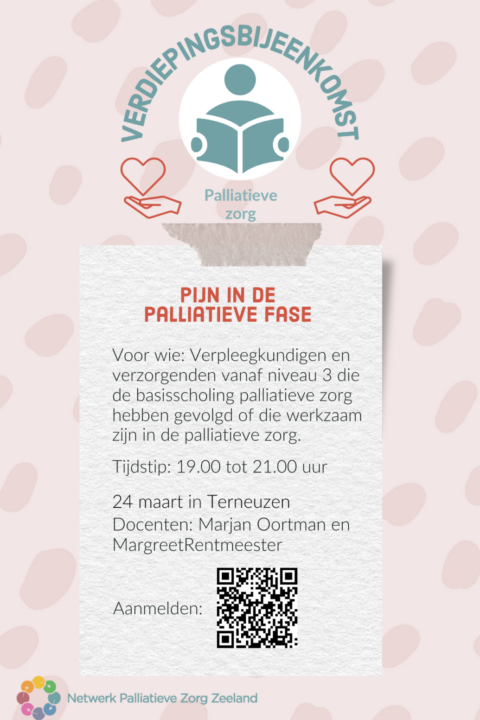 Deze verdiepingsbijeenkomst gaat over PIJN, in de palliatieve fase. Deze scholing wordt gegeven in Goes of Terneuzen. Er is plaats voor 20 deelnemers (vol = vol). De kosten voor deelname bedragen €20,-. De scholing is voor verpleegkundigen vanaf niveau 3 die de basisscholing palliatieve zorg hebben gevolgd. Ook is de scholing beschikbaar voor verpleegkundigen vanaf niveau 4 die werkzaam zijn in de palliatieve zorg.