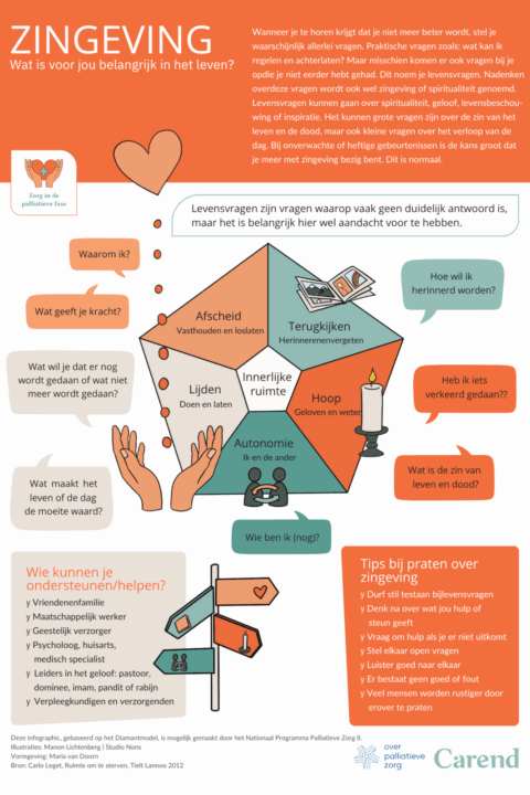 Soms helpt het daarnaast om bepaalde onderwerpen ook visueel uitgelegd te krijgen. De posters van Carend bieden heldere infographics over thema’s zoals zingeving, pijn, angst, afscheid nemen en het levenseinde. Ze maken moeilijke onderwerpen bespreekbaar, voor jezelf én in gesprek met je naasten of zorgverlener.